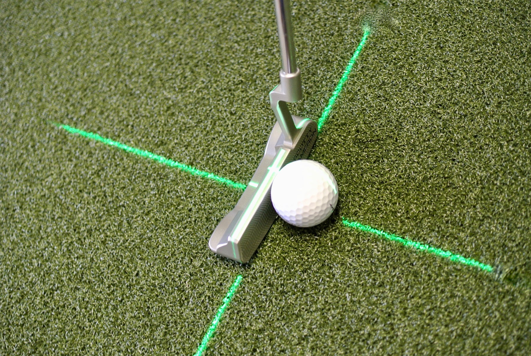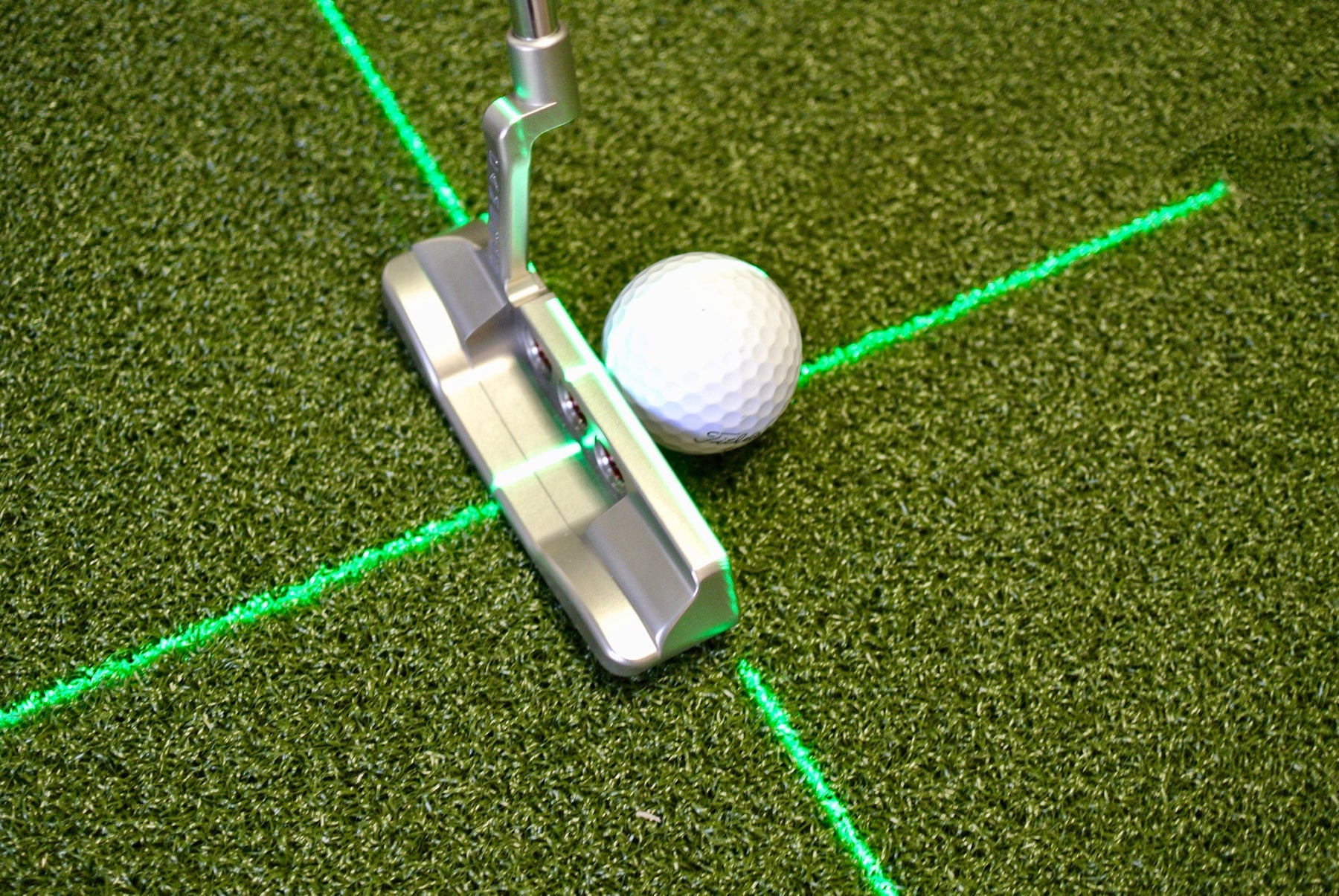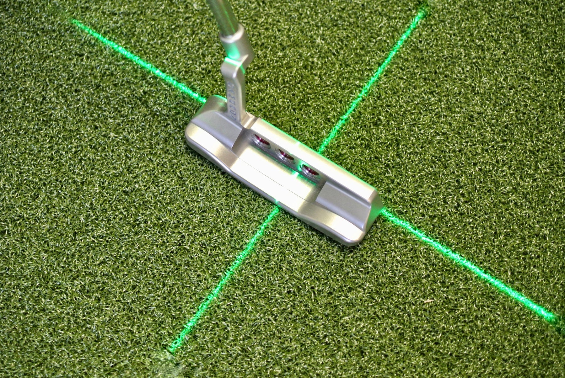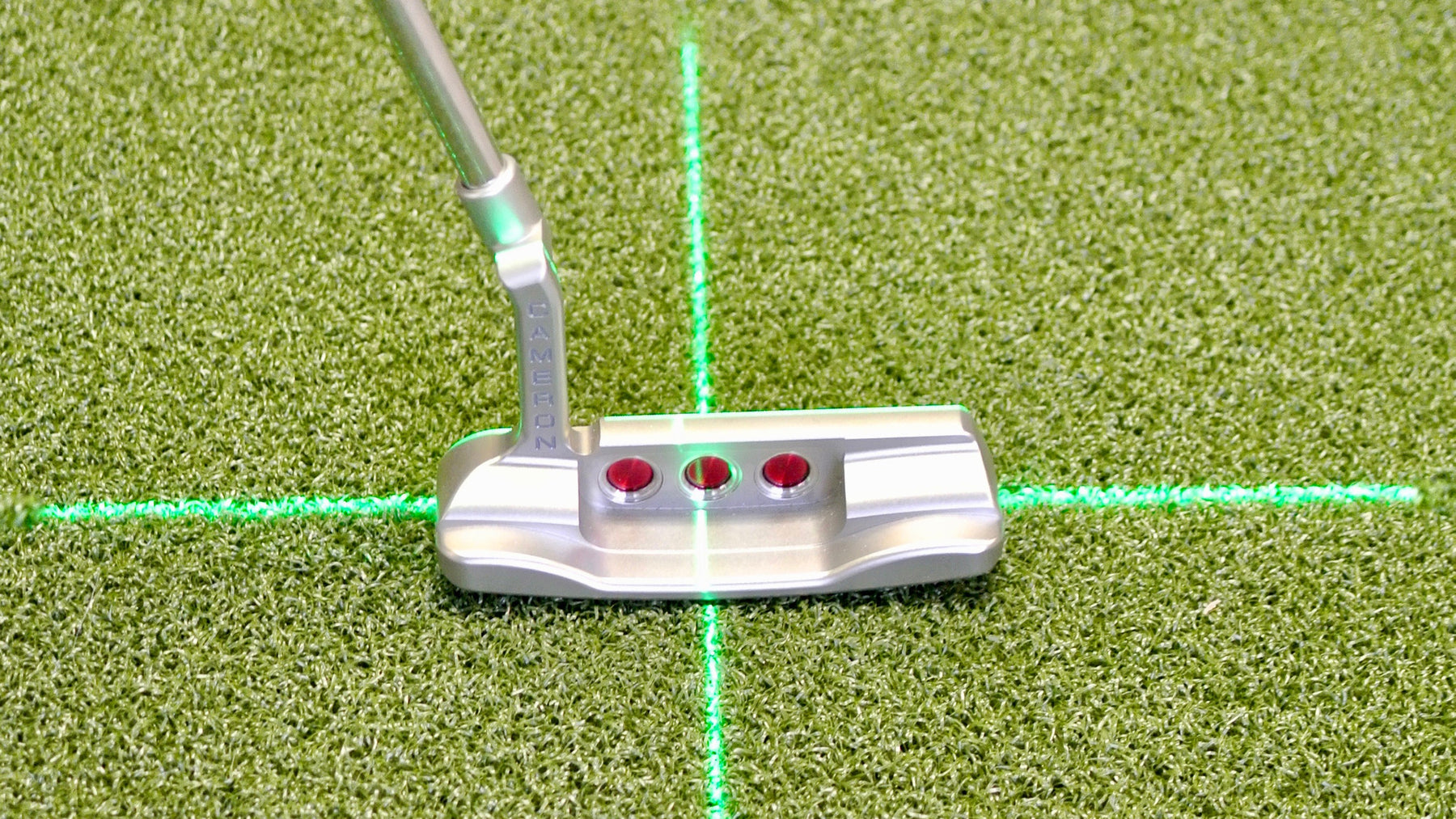 Shine the laser onto the impact point of the putter, bisecting the head.
