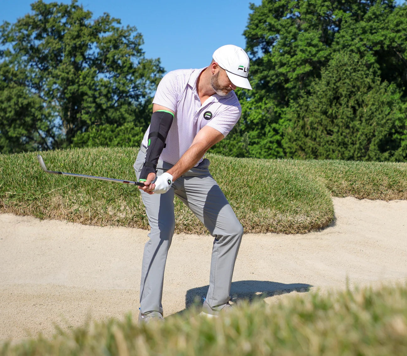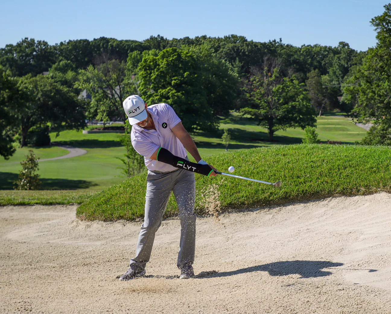 The FLYT Sleeve is designed for all aspects of the golf swing. For full swings it is best utilized on the front/lead arm (left arm for a right-handed golfer), keeping the arm straight in the back swing and reducing over rotation of the club head through the impact zone. When chipping and pitching it is best utilized on the back/trail arm (right arm for a right-handed golfer) promoting the straight arm chipping and pitching technique to minimize the influence of the hands and arms, increasing swing width and using the bounce correctly for a shallow swing every time. During the putting stroke our FLYT Sleeve can be worn on either arm to reduce movement in the right or left hand throughout the putting stroke to achieve the desired result and reduce movement.