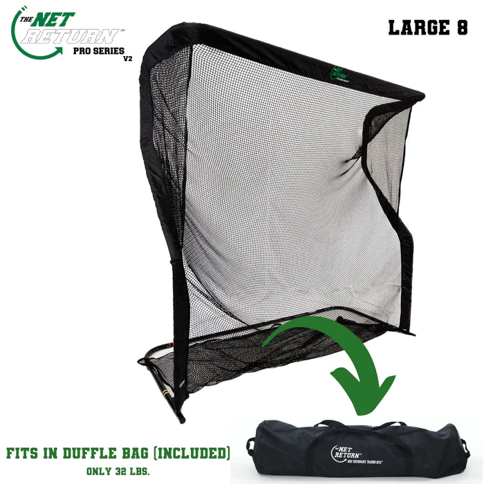The Net Return Large 8 Pro Series V2 Golf Practice Net -- 8' x 8' - Made in the USA. Enhance your golfing skills and enjoy the convenience of practicing from the comfort of your own home, yard, or garage. This high-quality golf net is designed to provide a realistic and reliable practice experience for golfers of all levels. With its durable construction and versatile design, it is the ultimate training tool for golf enthusiasts. The Net Return Large 8 golf net offers exceptional durability and performance. Constructed with premium materials, it is built to withstand the strongest swings and shots. With a 8' width x 8' height, the size provides ample space for practice while maintaining portability and easy setup. Whether you're a beginner looking to improve your swing or a seasoned golfer perfecting your technique, this golf net is the ideal companion.
